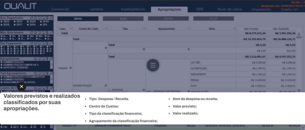 4.0. –  DashBoard ERP Qualit Construção – Apropriações: