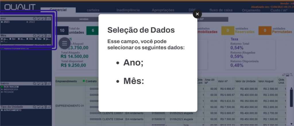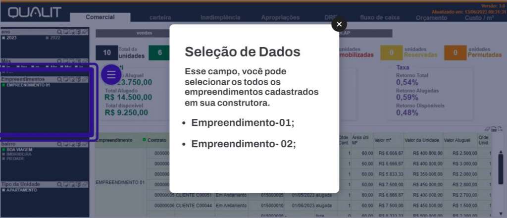 Nesse local, o usuário pode selecionar os dados de um ou vários empreendimentos, a partir dessa seleção o sistema carrega os dados.