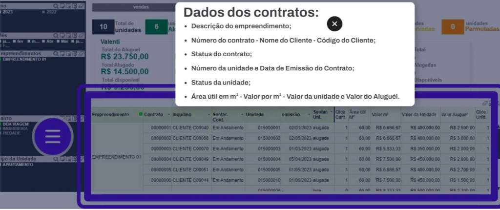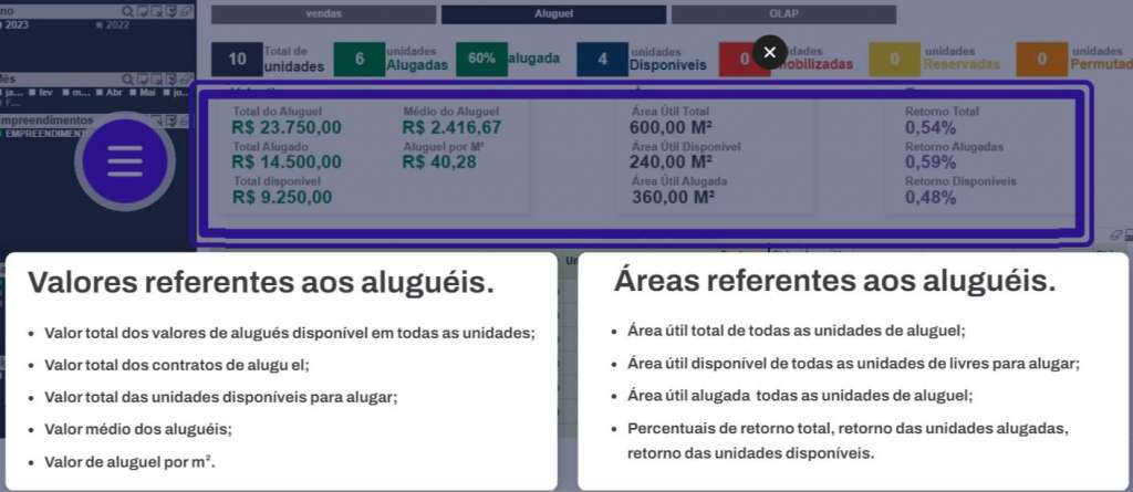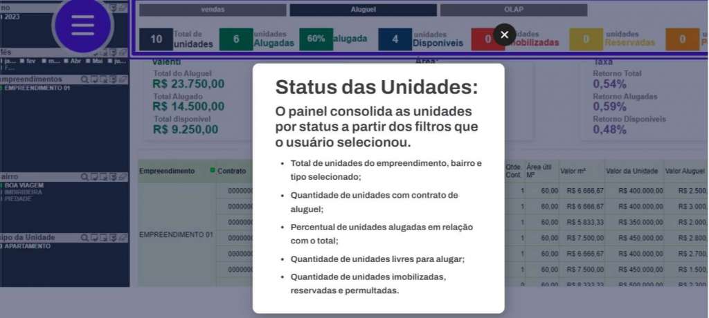 1.1.2 – Painel de Aluguel, apresentando todas as unidades da categoria por aluguel, apresentando valores recebíveis dos contratos.