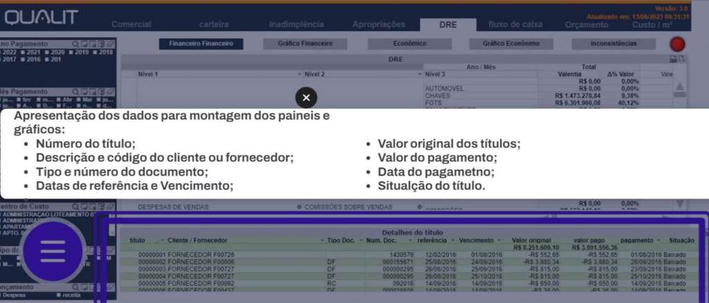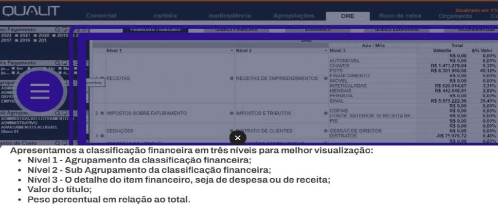 2.0. – DashBoard ERP Qualit Construção – DRE: A demonstração do resultado do exercício é uma demonstração contabilística dinâmica que se destina a evidenciar a formação do resultado líquido devendo ter alterações em um período. Nosso painel possui quatro apresentações: Financeiro – Gráficos Financeiros – Econômicos – Gráficos Econômicos: